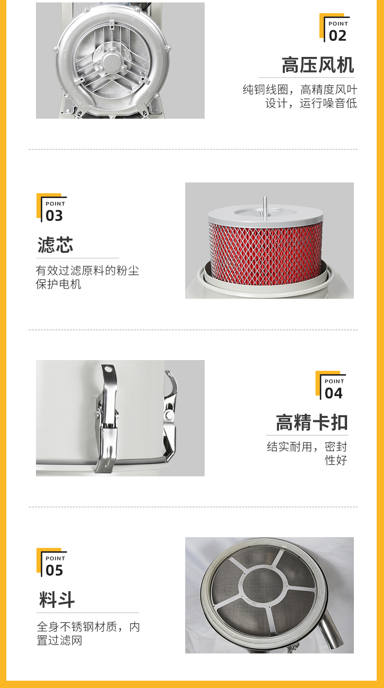 采用高速整流馬達,體積小、吸力強,適合新料輸送;