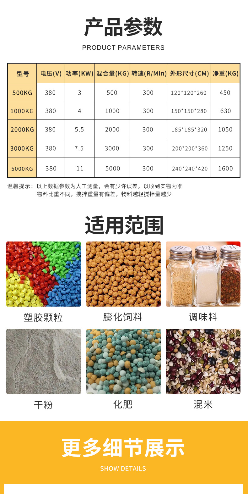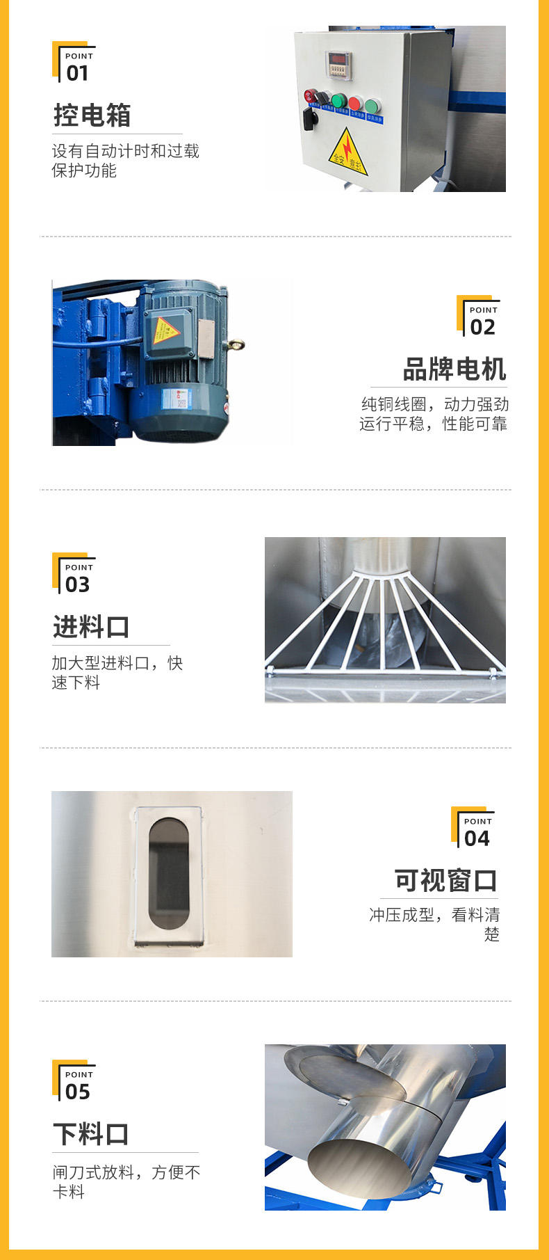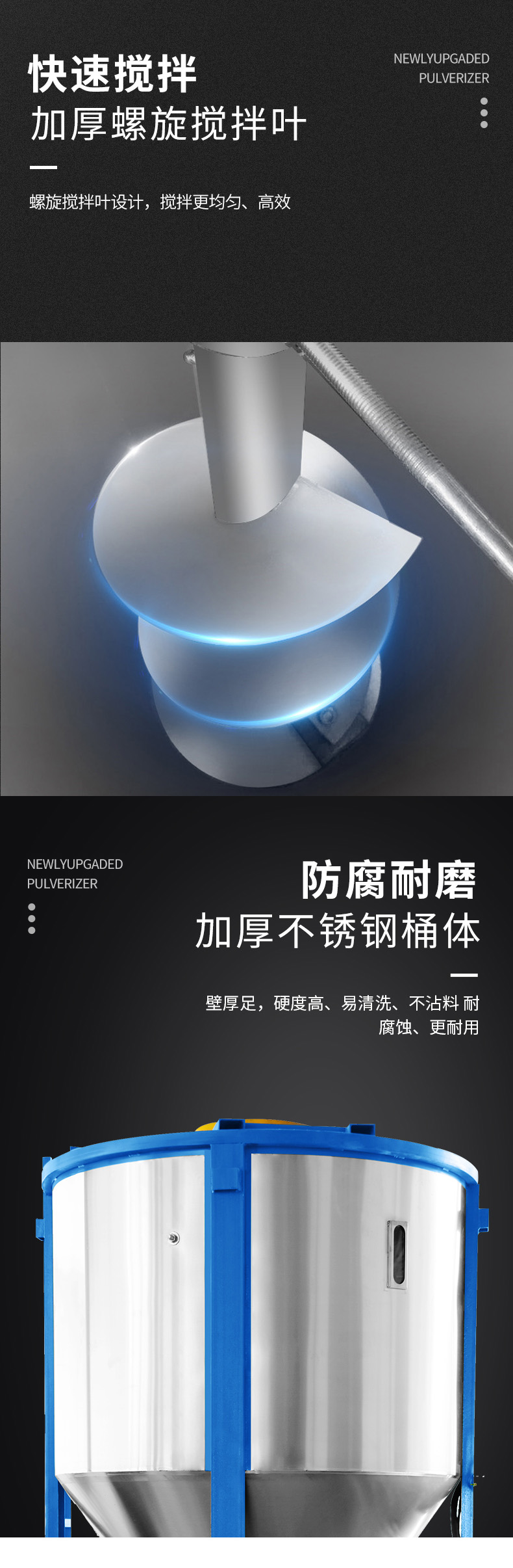 科天達全自動的大型立式拌料機,省時省力還省心,臺達排主導創新的視角。在內部中央部位有安裝一攪拌螺旋桿及簡運轉時。帶混合的原料在料筒底被螺旋桿卷入,沿著套筒被卷至頂端后均勻散落,讓機器在短時間內即可完成均勻混合節省能源綠色環保。設備表面均采用不銹鋼制造能確保原料不受污染,切實解決客戶在生產中遇到的難題助力工業企業高質高效發展。